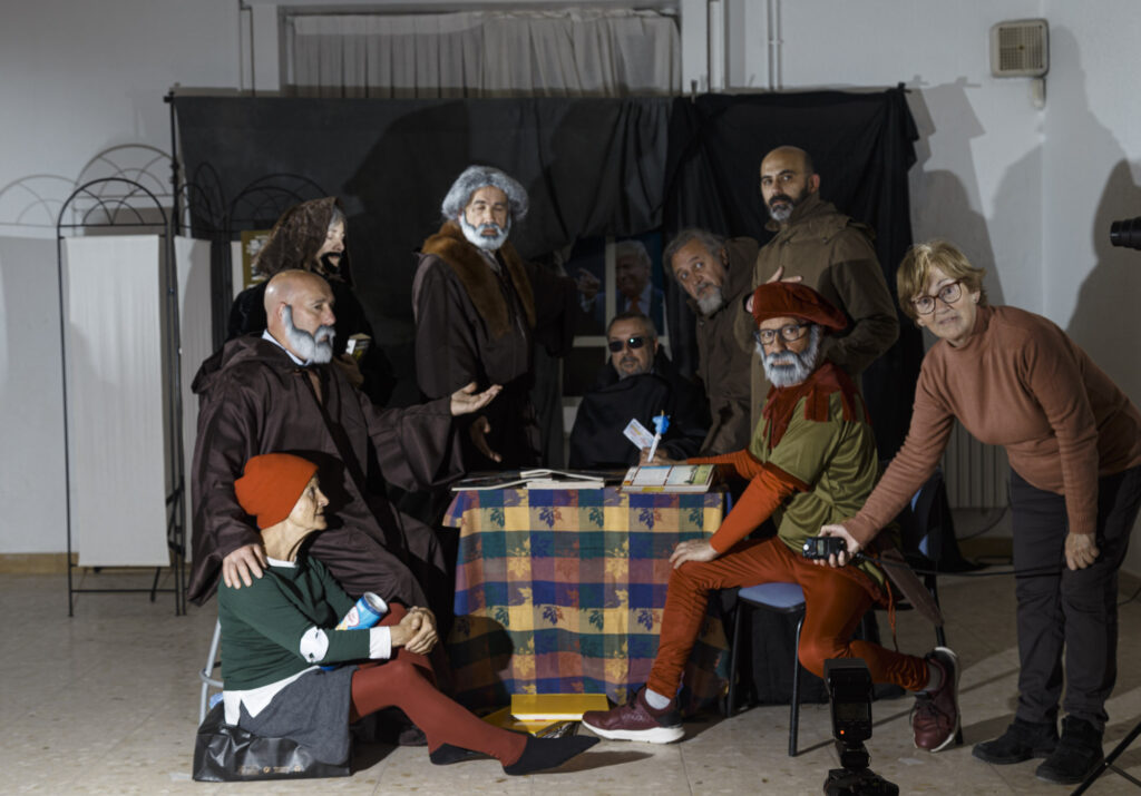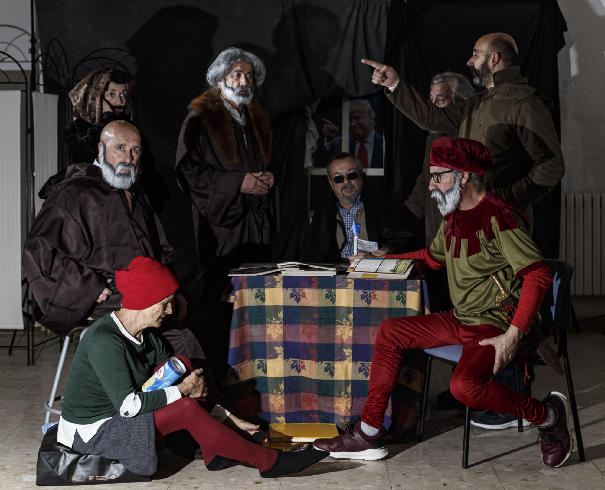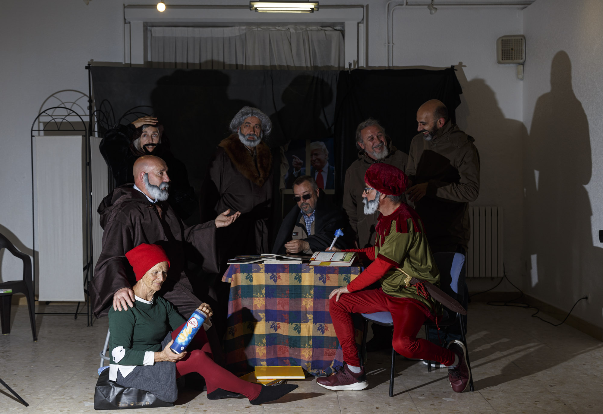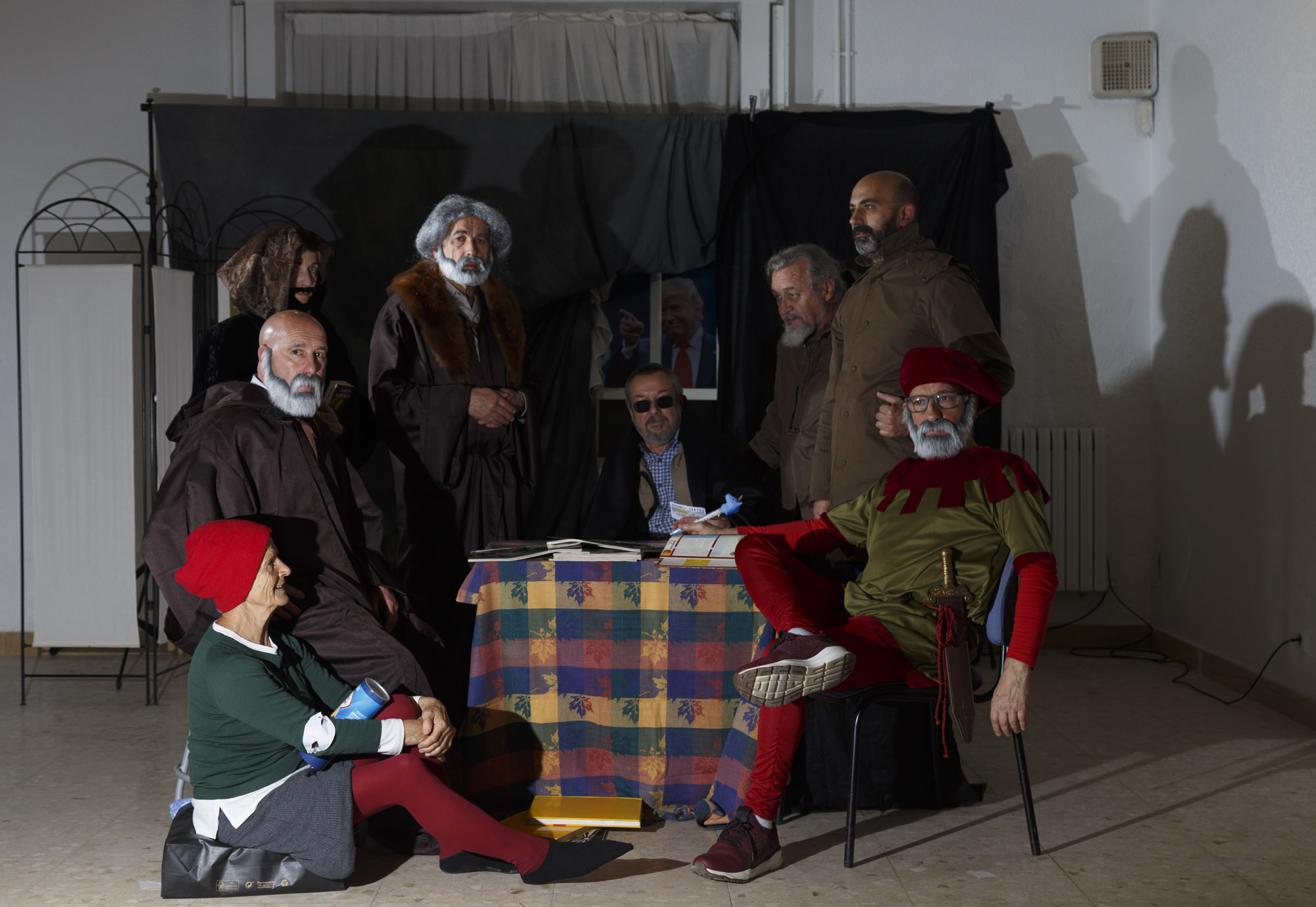 Colocado el escenario y la tramoya correspondiente y cada figurante con su atuendo adecuado, empezamos a probar la iluminación. Uno por uno se orientan los flashes hacia la zona o el personaje que debe iluminar cada uno. Medir, disparar, comprobar, volver a medir… Así uno tras otro hasta conseguir el efecto deseado.