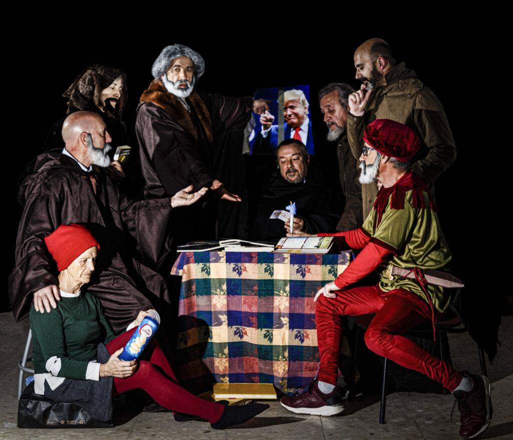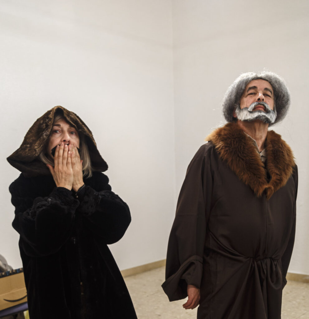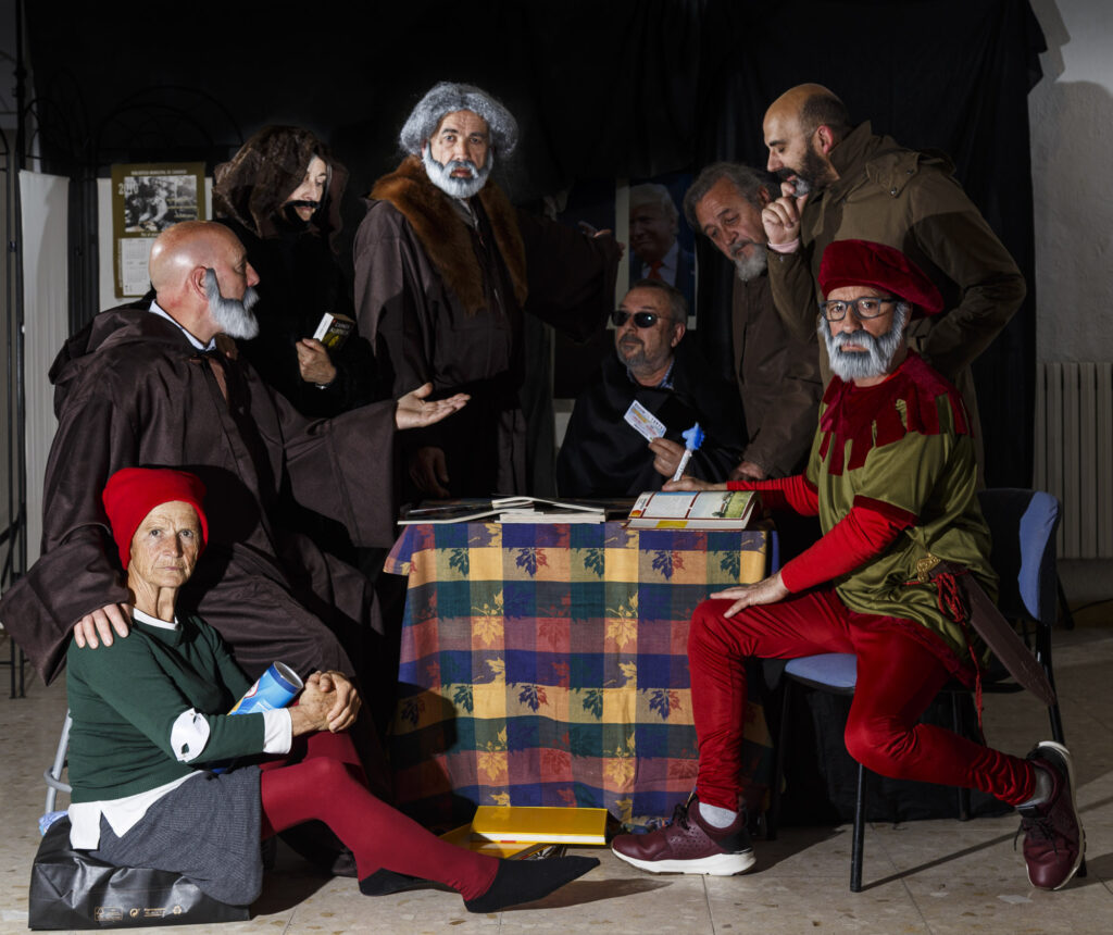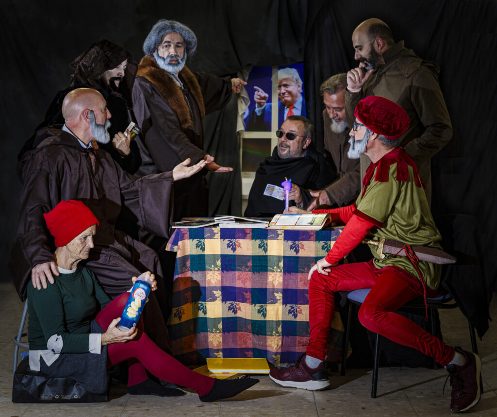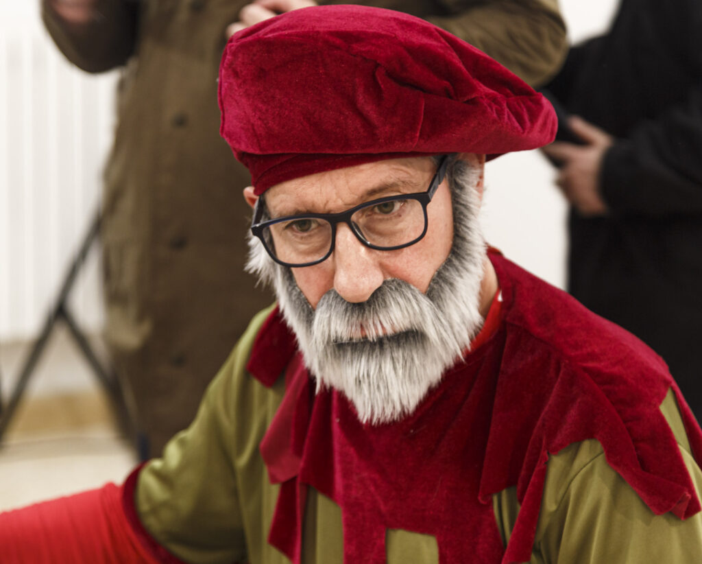 Colocado el escenario y la tramoya correspondiente y cada figurante con su atuendo adecuado, empezamos a probar la iluminación. Uno por uno se orientan los flashes hacia la zona o el personaje que debe iluminar cada uno. Medir, disparar, comprobar, volver a medir… Así uno tras otro hasta conseguir el efecto deseado.