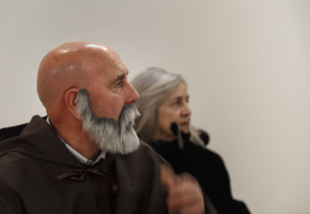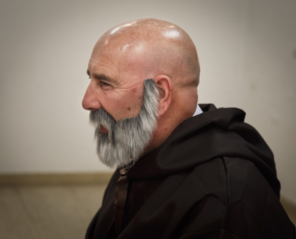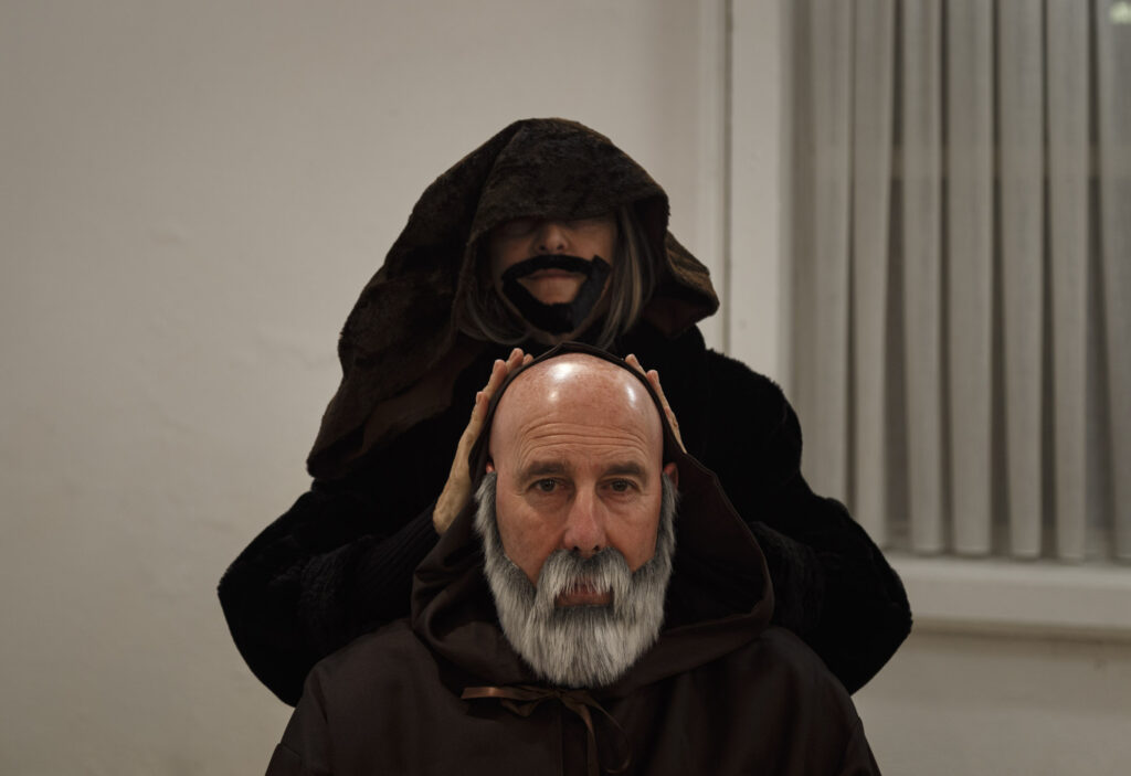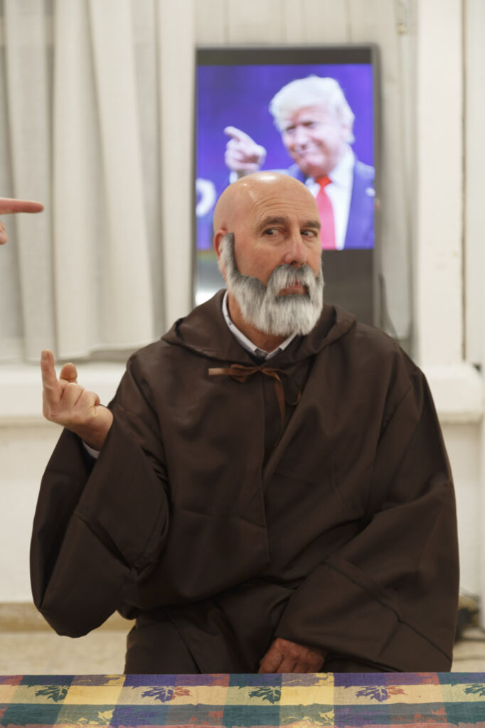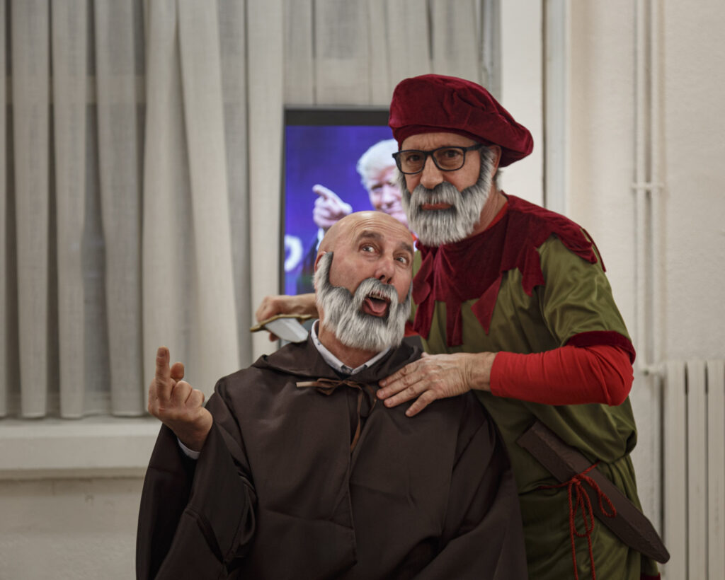Decidimos empezar con la primera pintura, «Cristóbal Colón en el Convento de la Rábida». Después de algunas pruebas en estudio, conseguido el atrezzo necesario y cargados con cámaras, trípodes, fotómetros, flashes, triggers, telas…, nos encaminamos al plató.