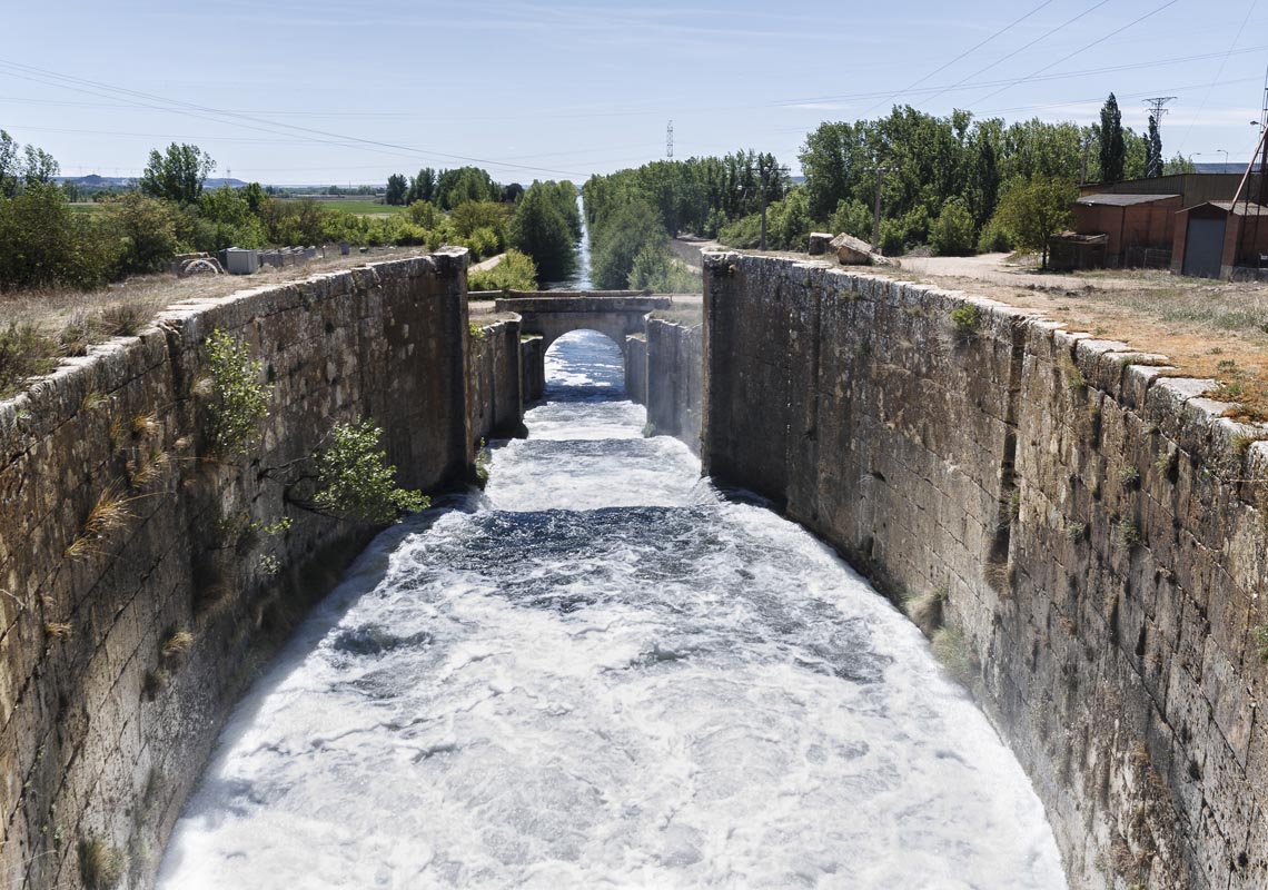 Este es un punto estratégico porque aquí, el 16 de julio de 1753, comenzó la construcción del Canal de Castilla. Las aguas del Carrión siguen su curso y las del Canal el suyo.