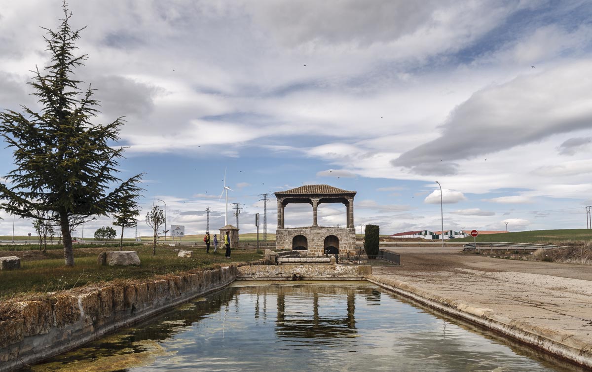Nuestra llegada se produce justo a la hora de comer; esa era la previsión. En el restaurante La Zilla habíamos hecho la reserva; buena comida y servicio agradable. Después de comer recorremos el pueblo; su grandeza y riqueza debió de ser considerable; de ello quedan innumerables pruebas: iglesias, en flagrante ruina alguna de ellas y colonizadas por una invasión de cigüeñas, edificaciones, plazas… A la salida del pueblo nos llama la atención el humilladero con fuente y estanque donde se refleja.