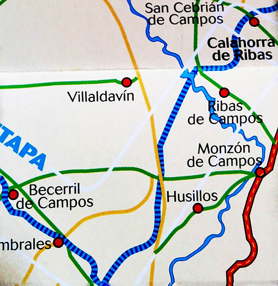 En Calahorra de Ribas está el punto kilométrico 74,7 contando desde Alar del Rey. Tomamos la margen izquierda, aunque es indiferente pues tanto la derecha como la izquierda tienen buen firme, pero con mucha piedrecilla suelta.