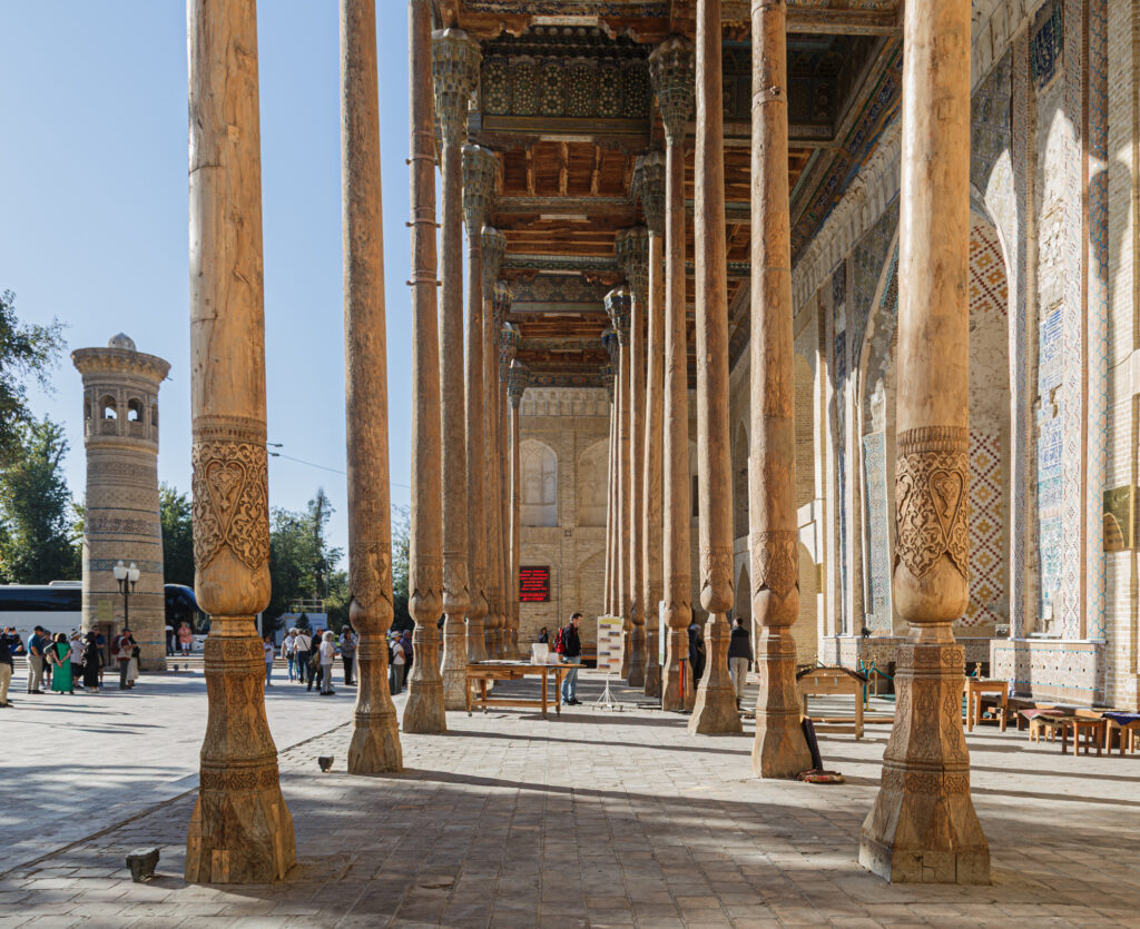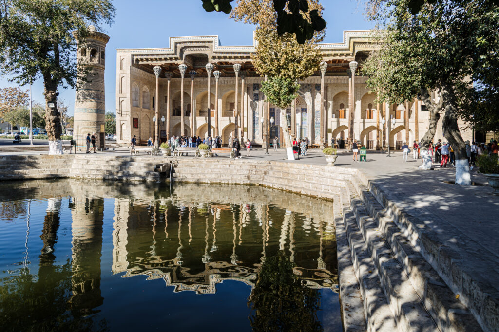 Hoy el día está repleto de actividades y lugares para visitar por eso salimos pronto del hotel. La primera parada, mezquita de Bolo-Khauz. Una doble fila de columnas altas y esbeltas dan forma al pórtico; el interior es reducido, pero ricamente decorado. La mandó construir el Emir Shakhmurad para la oración de los viernes. A su lado hay un pequeño minarete y un estanque, que dio el nombre al conjunto.