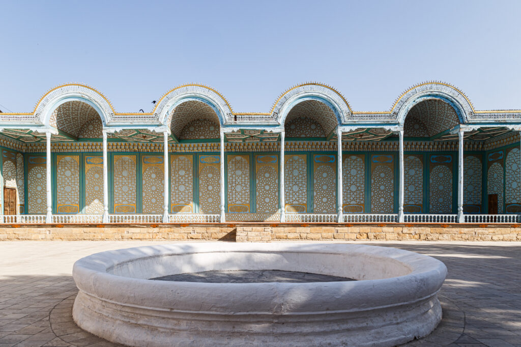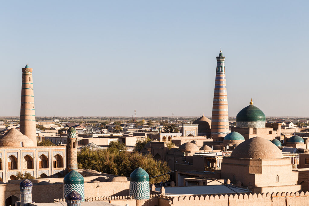 Khiva es una pequeña ciudad casi perdida en el desierto; 2500 años de historia la contemplan. El barro y el adobe es el material constructivo más importante de la ciudad. Impresiona el maravilloso conjunto amurallado de Ichan Qala, auténtico museo al aire libre. Madrazas, minaretes, mezquitas… se suceden sin solución de continuidad.