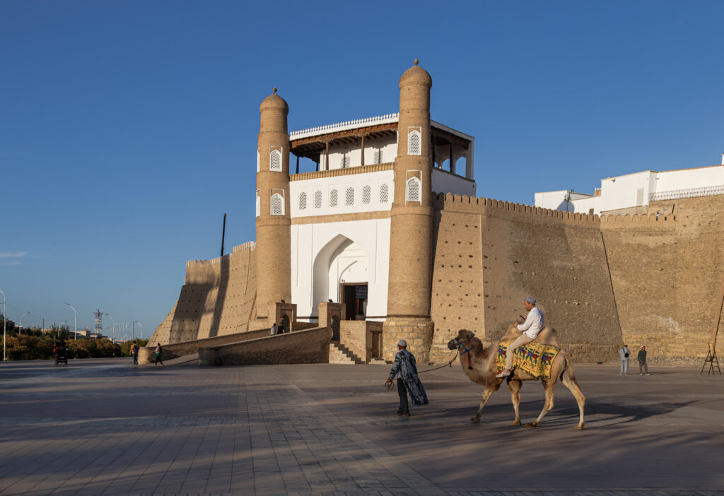 Por la tarde, ya a la caída del sol, nos acercamos a la Ciudadela Ark. Fue residencia bien fortificada de los emires de Bukhara. Está situada en una zona levemente elevada desde la que se domina toda la ciudad; constituye su monumento arquitectónico y arqueológico más antiguo. Tiene una superficie considerable; en ella se trabaja en la búsqueda y reconstrucción de estructuras destruidas. La altura permite unas buena vistas panorámicas de la ciudad y su entorno.