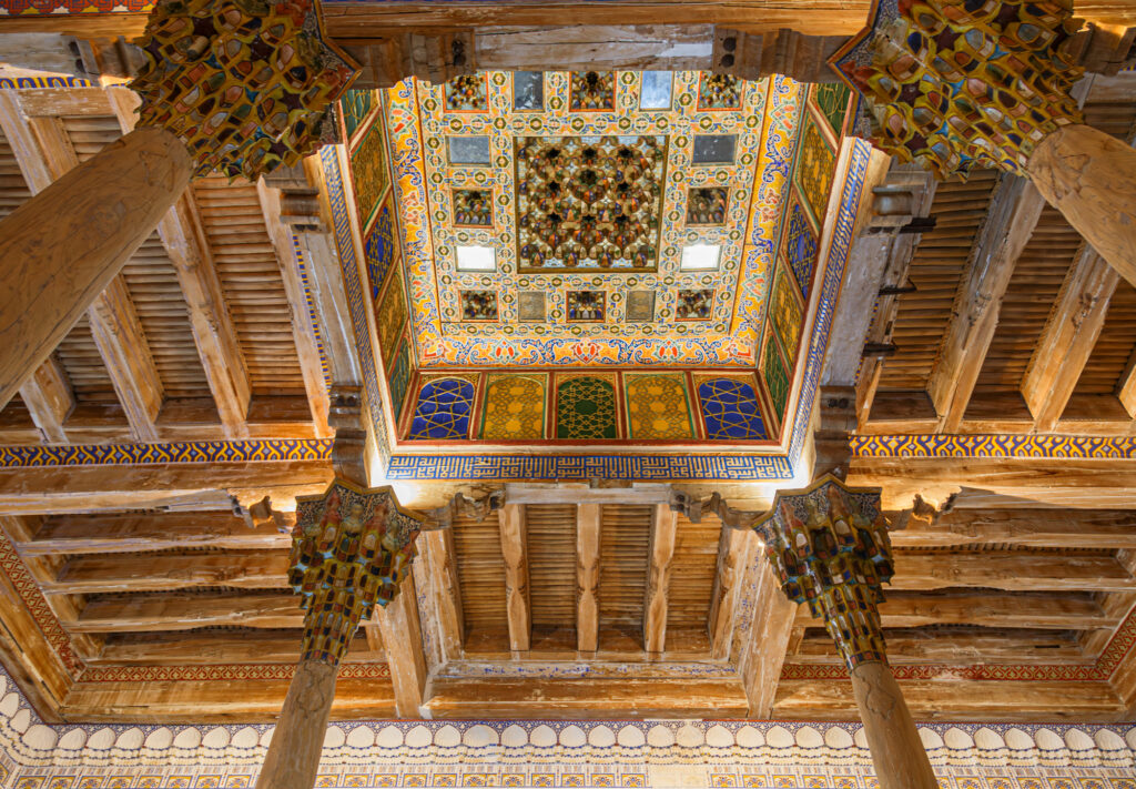 Por la mañana del día 10 visitamos el Palacio de Verano de los Emires de Bukhara; ha sufrido a lo largo de la historia destrucciones y reconstrucciones varias. La última reconstrucción es de los años veinte del siglo pasado con retoques posteriores al final de la época soviética. Hoy sus habitaciones albergan espacios museísticos. A su lado hay una pequeña mezquita de madera; parece de juguete.