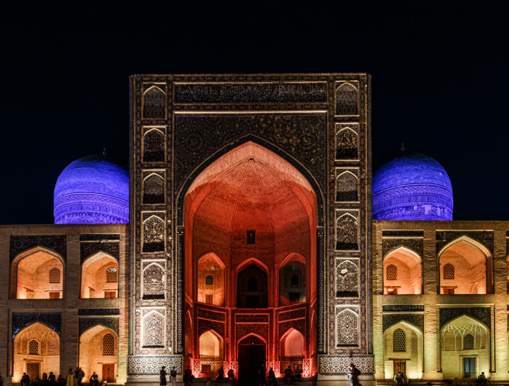 Tras la comida, regresamos al hotel para descansar. Por la tarde volvemos a la Plaza Registan. Asistimos al espectáculo de luz y sonido. Es media hora de color y música, una auténtica borrachera de colores; luces rojas, amarillas, verdes turquesas… con sus infinitos matices son proyectadas sobre las fachadas de las madrasas arrancando de los azulejos que las recubren un número indefinido de tonos y reflejos distintos. Quedamos encantados con el espectáculo y regresamos al hotel todavía palpitando la emoción luminosa en nuestros ojos.