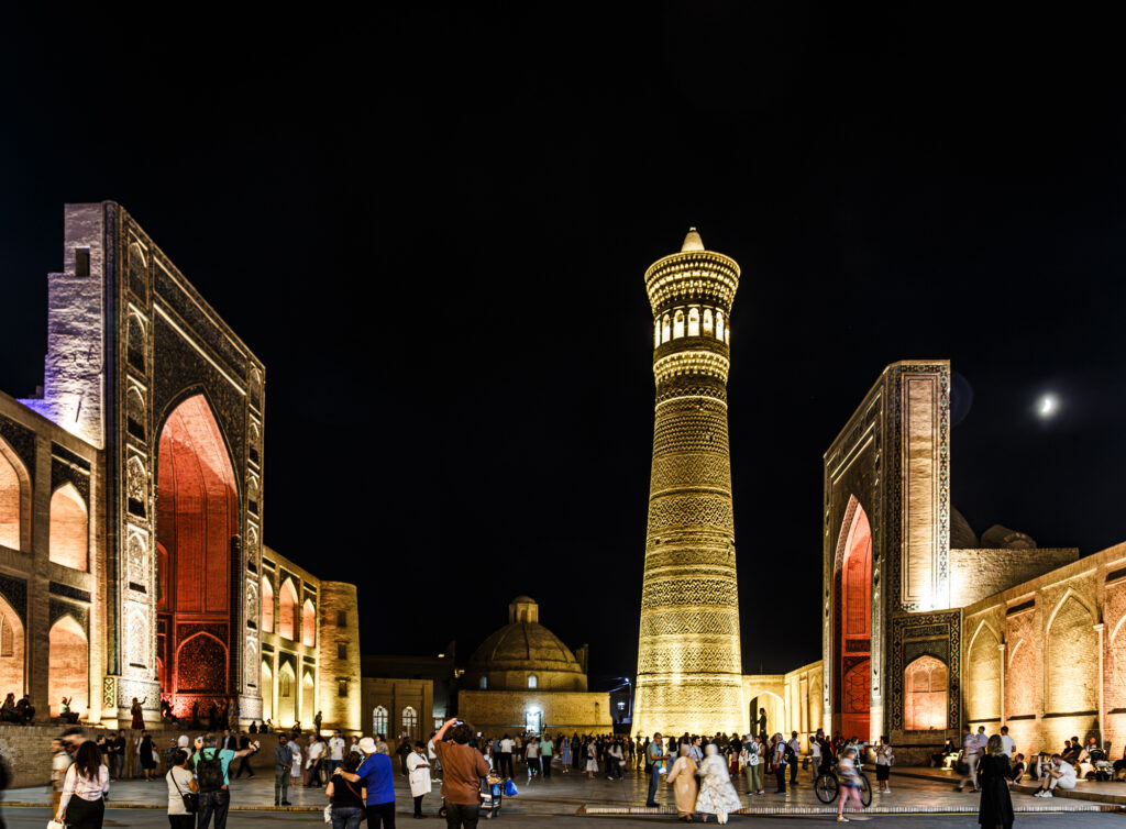 Por la noche, retornamos a Poi Kalon para disfrutar del atractivo espectáculo de mezquita, madraza y minarete profusamente iluminados.