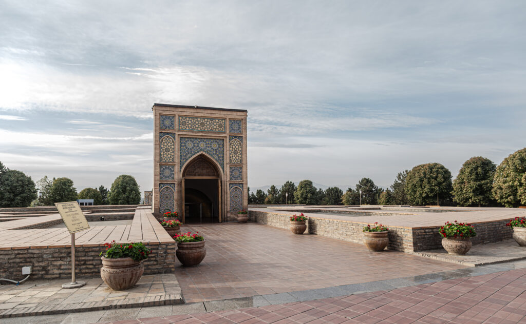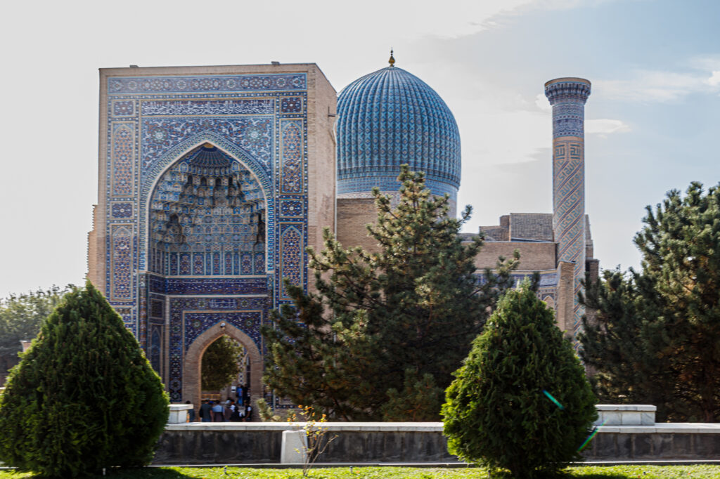 La primera visita que realizamos es el mausoleo Guri Emir (siglos XIV y XV), la tumba de Tamerlan y su familia. Amir Timur creó un imperio con capital en Samarcanda; es el fundador de la dinastía de los Timúridas.