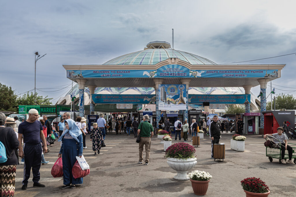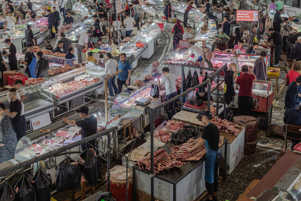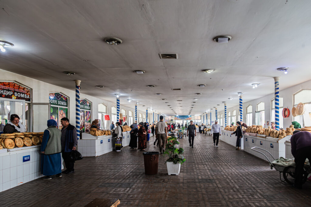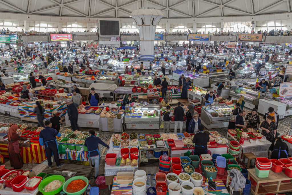 El Bazar Chorsu es un mercado inmenso. Tiene un interés especial porque representa un tipo de comercio oriental. Bajo su gran cúpula se puede encontrar de todo: frutas, verduras, carnes, dulces, pan… Tiene fama por la elaboración de un pan excelente; no lo probamos, pero sí observamos el ajetreo de multitud de panaderías trabajando a la vista de todo el público. Nos extraña bastante cómo tienen los puestos de carne; desde nuestro punto de vista echamos de menos más higiene, limpieza y forma adecuada de conservación.